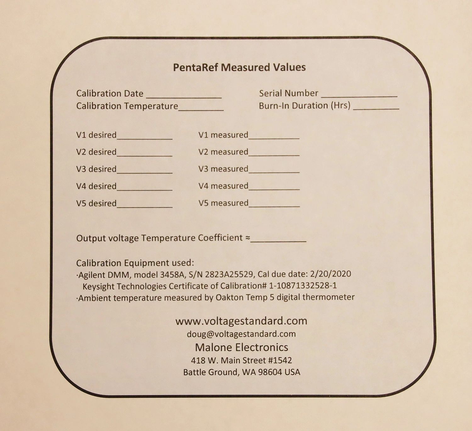 All five output voltages are derived from a Linear Technology LT1021BCN8-5 buried Zener reference IC. To insure long term stability, before shipment each PentaRef is continuously powered-up for a minimum of 250 hours, and then adjusted using our calibrated, 8.5 digit, Keysight 3458A DMM Keysight Certificate of Calibration WO-01038932, valid through March 1, 2026. The calibration temperature is typically 68 degrees F.