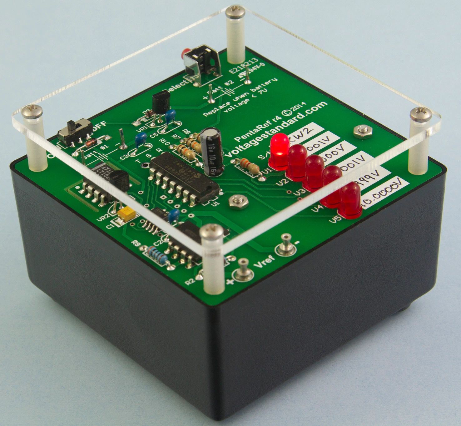 • Clear 1/8" thick acrylic cover plate prevents damage if an object is accidentally dropped onto your PentaRef. Since the cover is clear, the power-on LED, voltage selector push button, and connection terminals are easily seen and accessed.